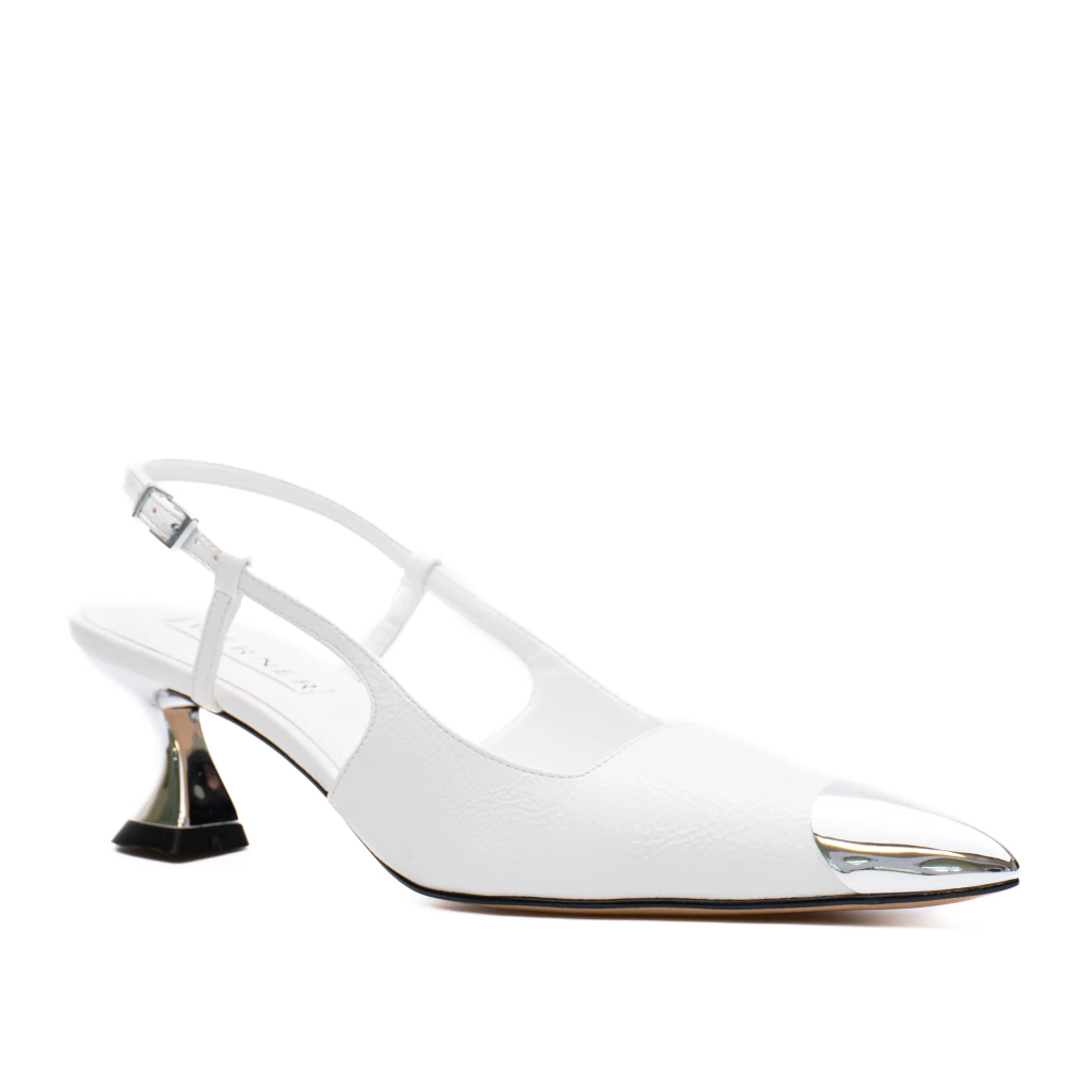 A cor desse modelo é um tom de branco em material verniz texturizado com salto e biqueira prata.