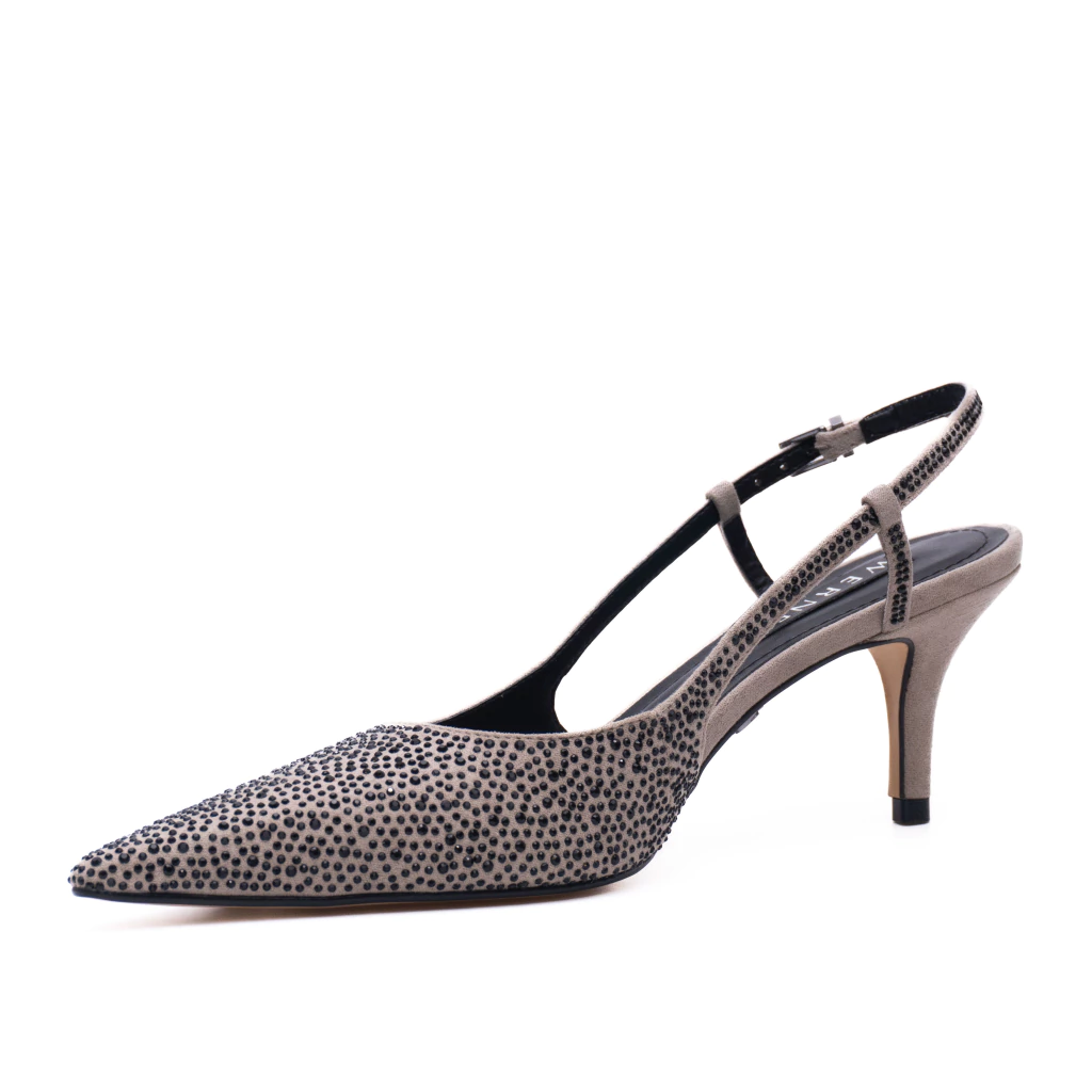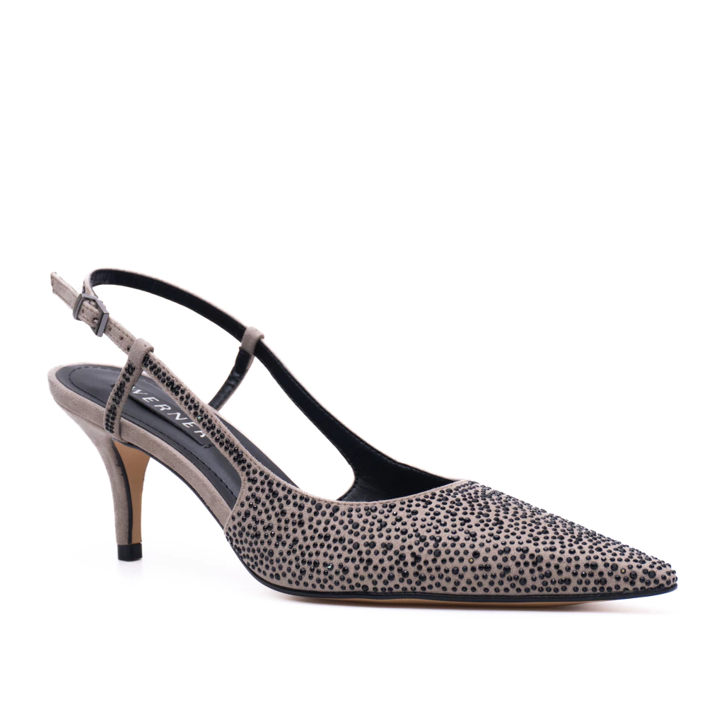 O slingback Leona combina sofisticação e modernidade em um design refinado. Confeccionado em material camurçado, ele é adornado com pedrarias delicadas, que adicionam brilho e glamour ao modelo. Seu bico fino alonga a silhueta, enquanto o salto médio na altura de 6,5cm proporciona conforto e elegância. A tira ajustável no calcanhar garante um ajuste perfeito.