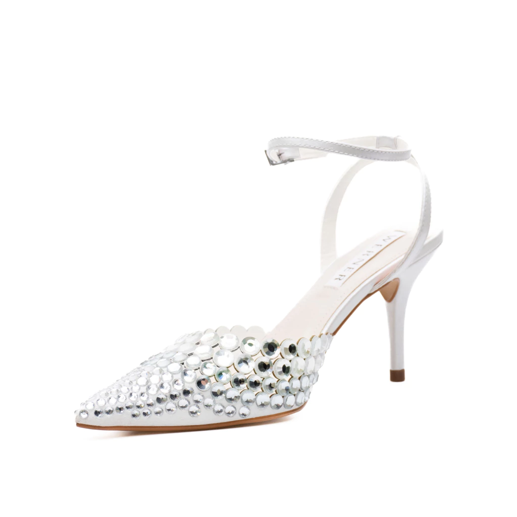 O Slingback Couro Branco Perolado Giorgia Werner é puro encanto: confeccionado em material couro branco perolado com acabamento acetinado, o modelo é inteiramente bordado com cristais translúcidos de diferentes tamanhos, criando um efeito de brilho sofisticado e impactante.