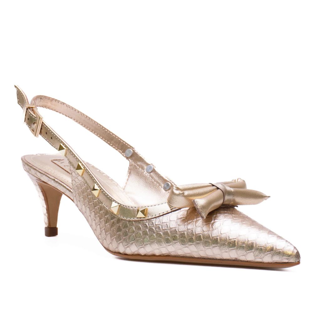 O Slingback Couro Champagne Calissa Werner tem salto fino na altura de 5cm e bico fino. Produzida em material tramado estilo palha, ideal para o verão, possui a parte traseira aberta com fechamento de fivela lateral para melhorar ajuste. Possui contorno com aplicação de pirâmides metálicas e laço no cabedal.
