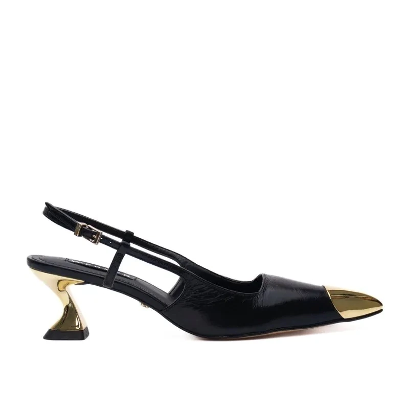 Com bico metalico e salto medio de 5cm, o slingback Lyra combina sofisticacao com modernidade. As tiras ajustaveis proporcionam um ajuste confortavel e seguro, enquanto o design aberto no calcanhar garante leveza e versatilidade. Ideal para compor looks sofisticados!
