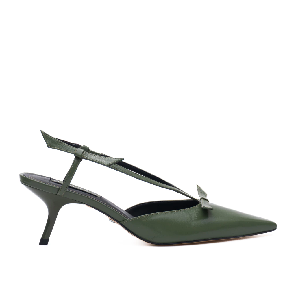 A cor desse modelo é um tom de verde oliva em material napa couro liso.