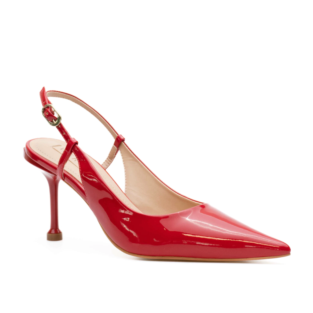 O Slingback Lilly tem salto médio fino na altura de 8cm e bico fino. Seu cabedal é produzido em verniz liso sintético e apresenta traseiro aberto com fechamento de tira fina em fivela lateral.