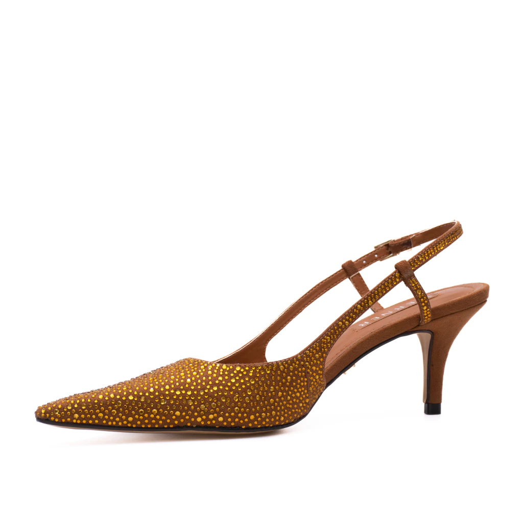 O slingback Leona combina sofisticação e modernidade em um design refinado. Confeccionado em material camurçado, ele é adornado com pedrarias delicadas, que adicionam brilho e glamour ao modelo. Seu bico fino alonga a silhueta, enquanto o salto médio na altura de 6,5cm proporciona conforto e elegância. A tira ajustável no calcanhar garante um ajuste perfeito.