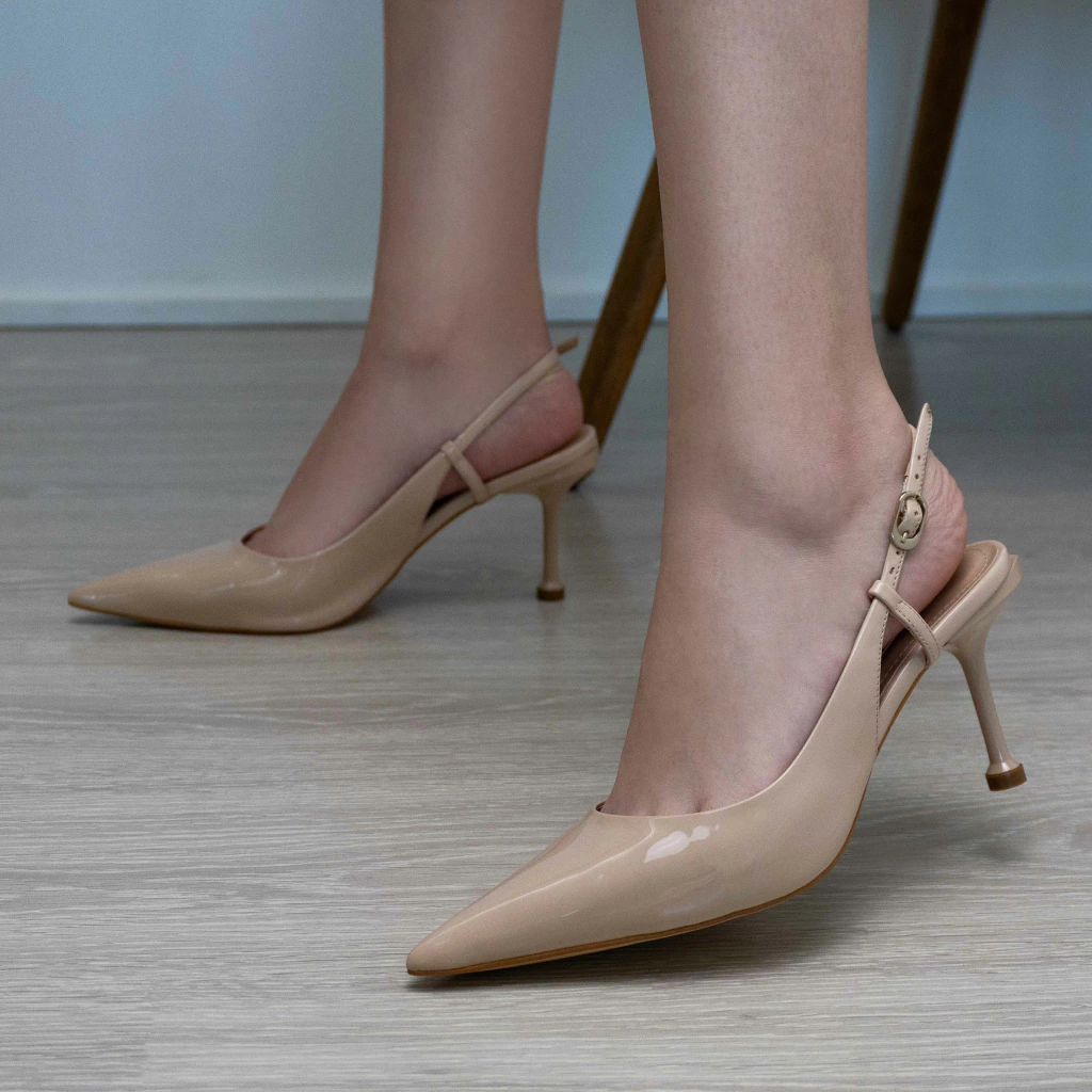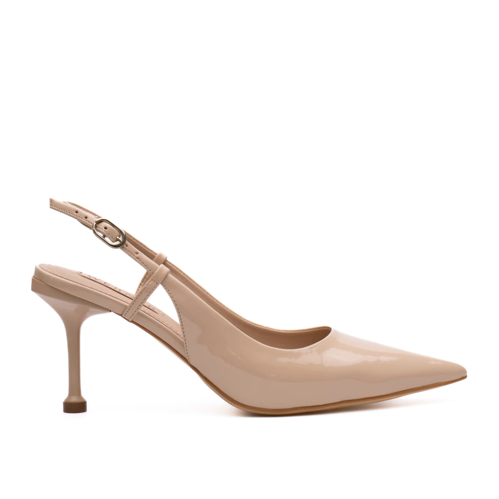 O Slingback Nude Lilly Werner tem salto médio fino na altura de 8cm e bico fino. Seu cabedal é produzido em verniz liso sintético e apresenta traseiro aberto com fechamento de tira fina em fivela lateral.