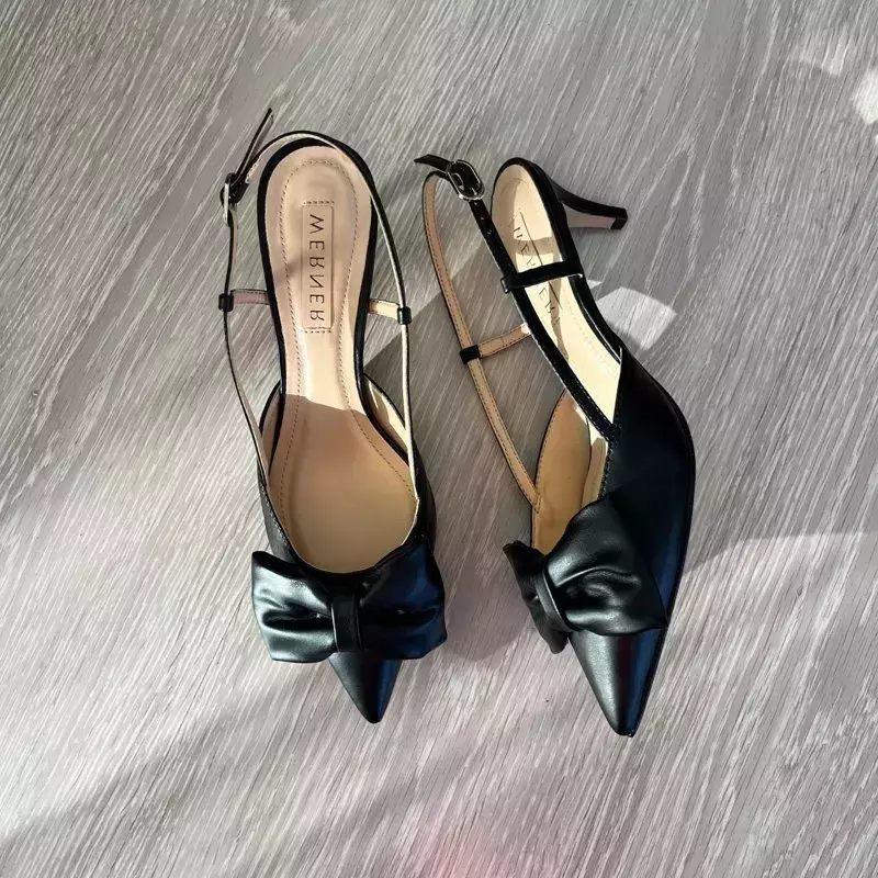 O Slingback Preto Com Laço Anika Werner possui salto de altura 4cm e bico fino, no estilo slingback ele se torna uma opção prática de calçar e deixa o toque glam para o laço frontal! Uma aposta super glamourosa e única!