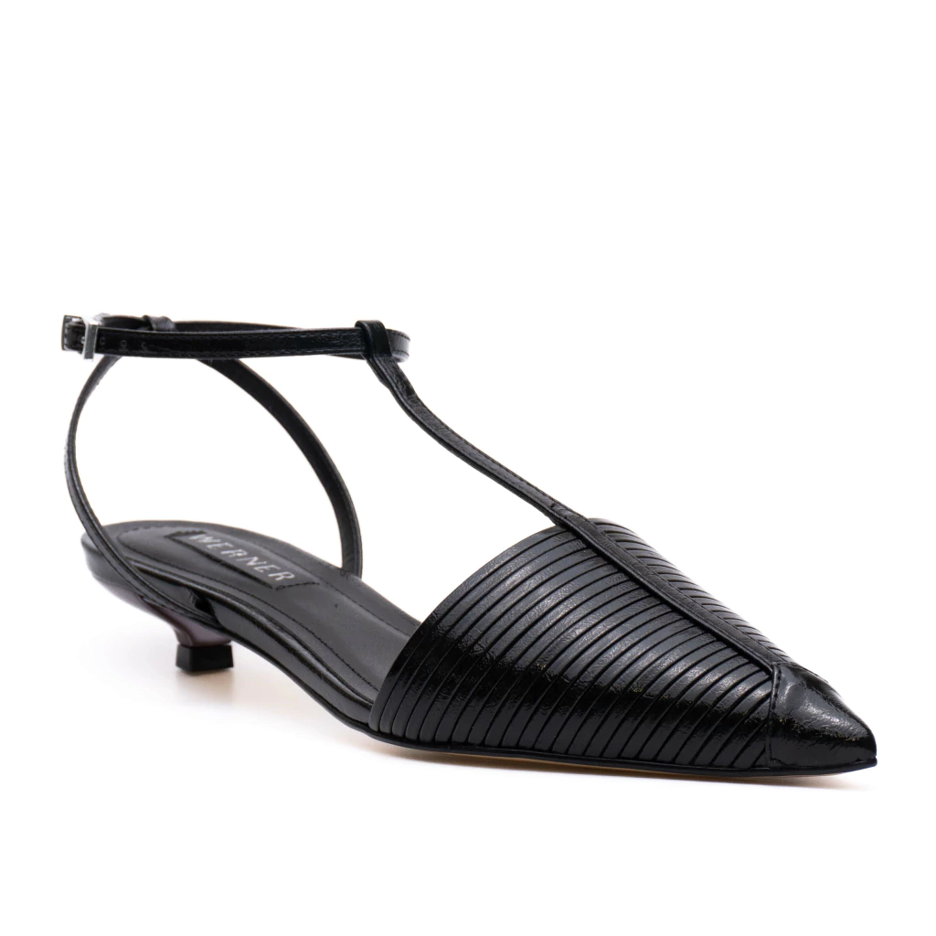 O Slingback Preto Gina Werner tem salto mínimo baixo na altura de 2cm e bico fino. Aberto atrás , possui recorte reto no cabedal composto por diversas tiras juntas e tira fina sobre o peito do pé. Possui tira fina que sai das laterais, se cruza no calcanhar, contornando o tornozelo e fecha em fivela lateral.
