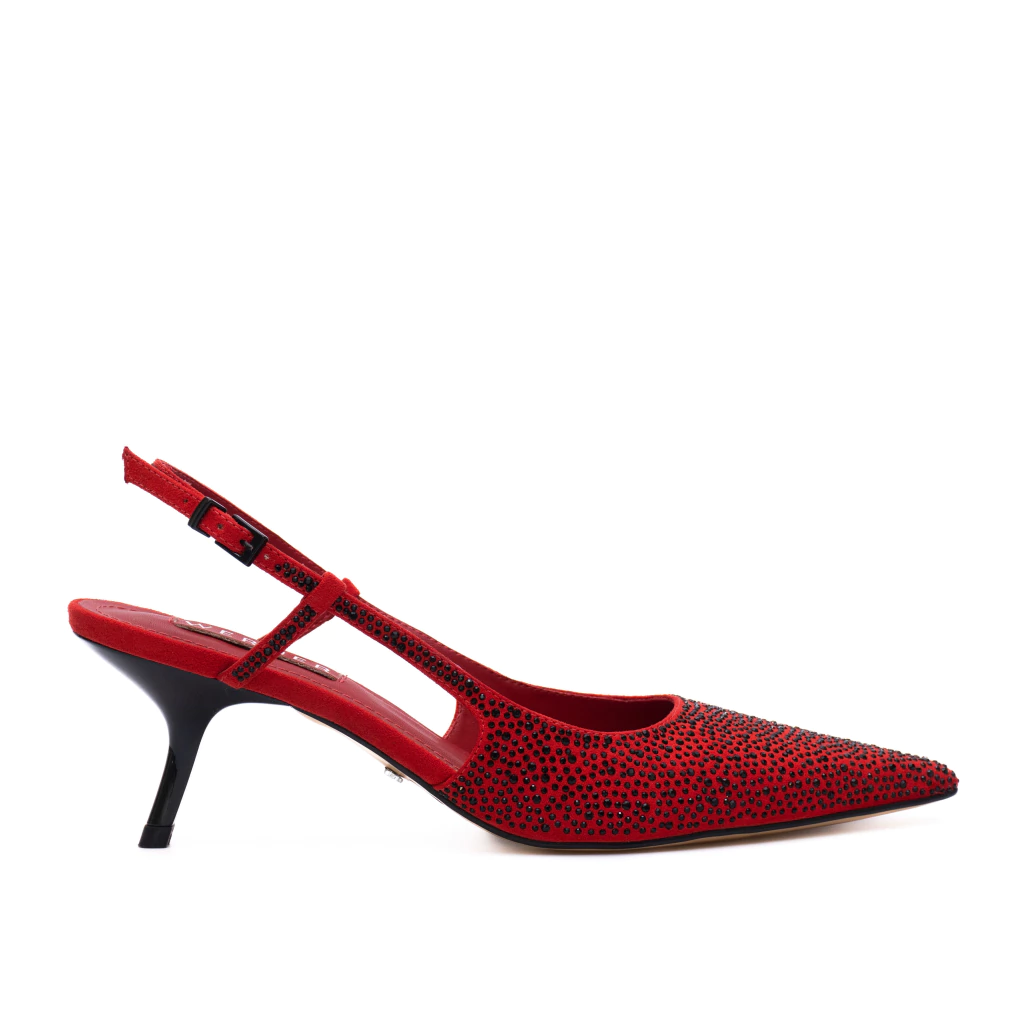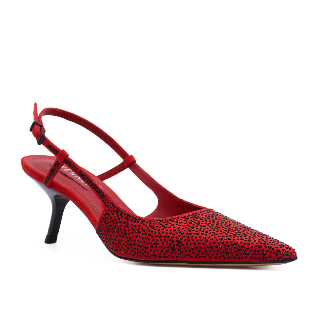 O slingback Leona combina sofisticação e modernidade em um design refinado. Confeccionado em material camurçado, ele é adornado com pedrarias delicadas, que adicionam brilho e glamour ao modelo. Seu bico fino alonga a silhueta, enquanto o salto médio na altura de 6,5cm proporciona conforto e elegância. A tira ajustável no calcanhar garante um ajuste perfeito.