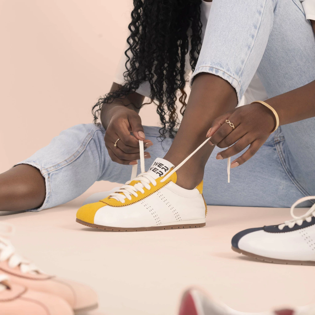 A cor desse modelo é um tom de branco em material napa couro liso e camurça couro amarelo.