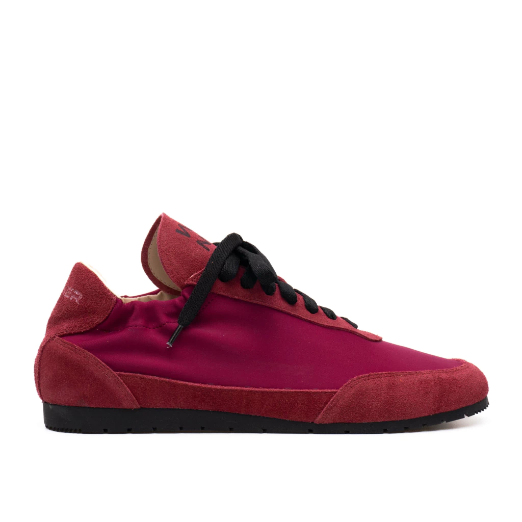 A cor desse modelo é um tom de bordô em material de camurça couro e lycra bordô