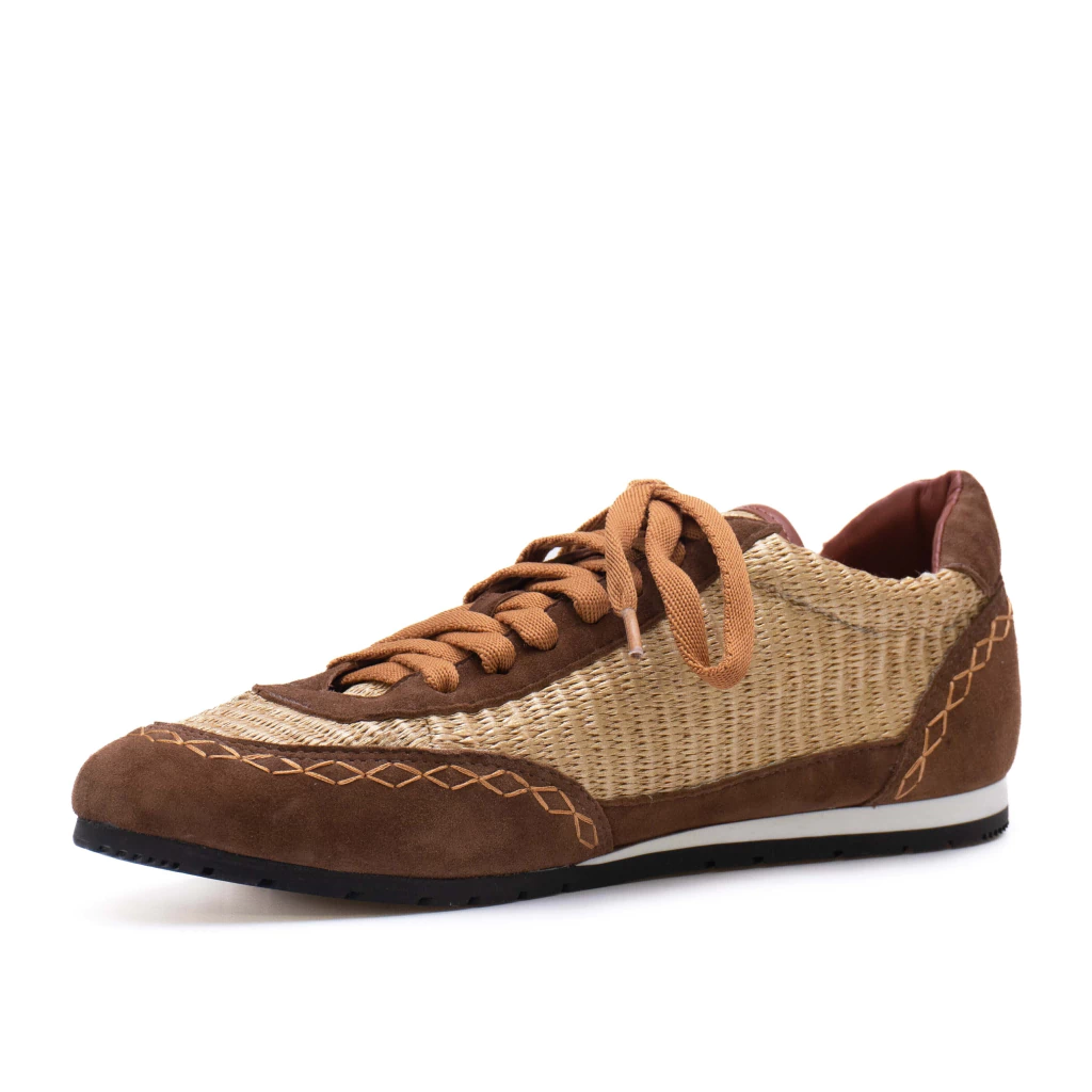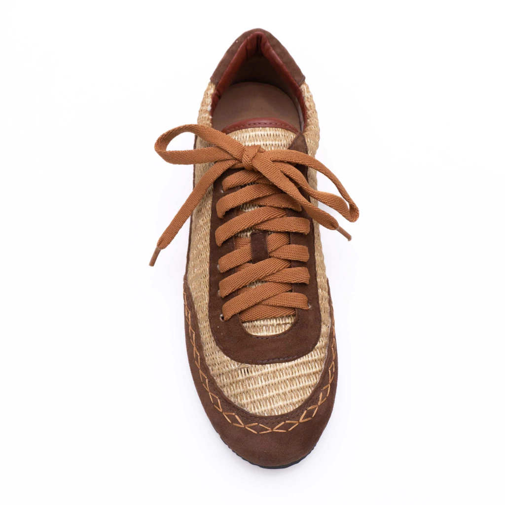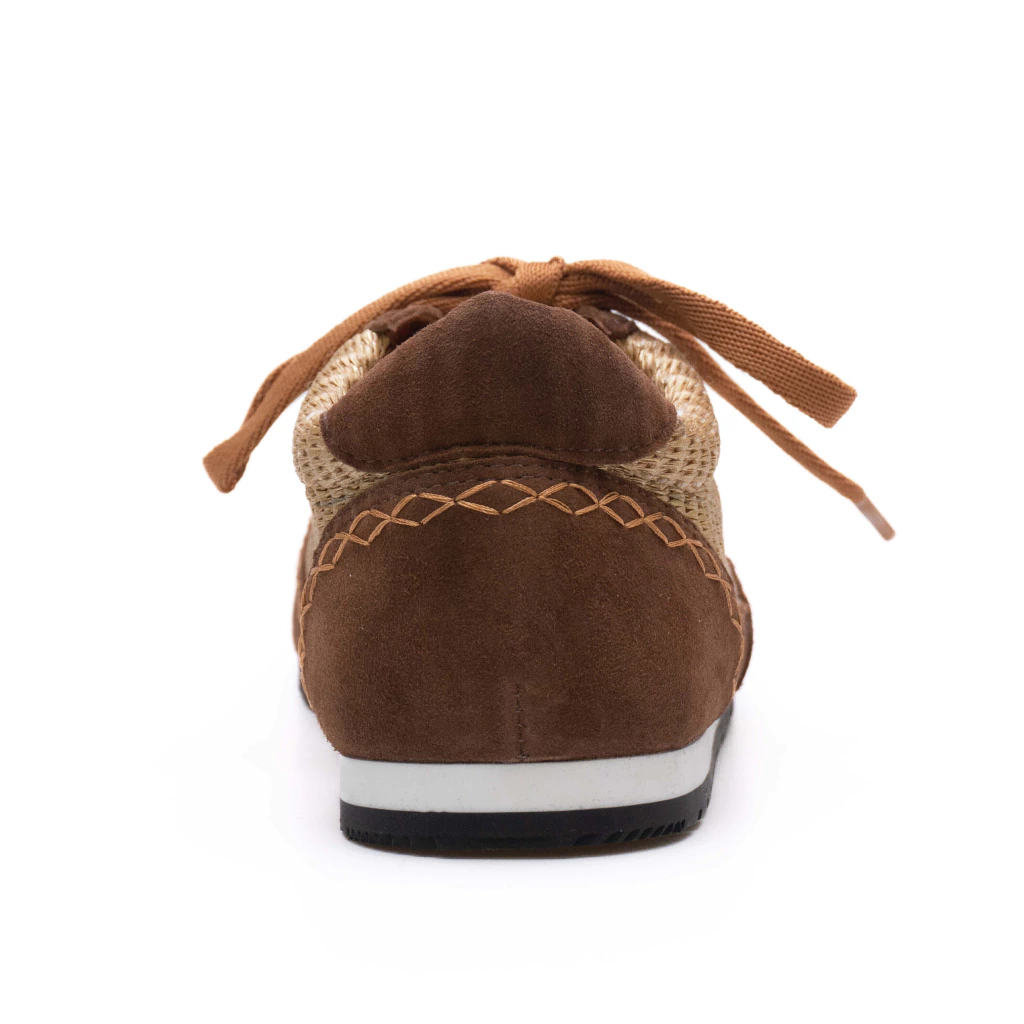A cor desse modelo é um tom de marrom em material camurça couro e material tramado natural.