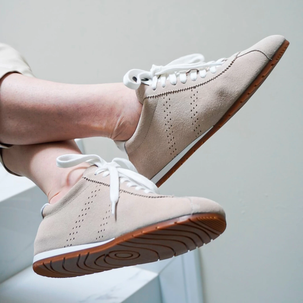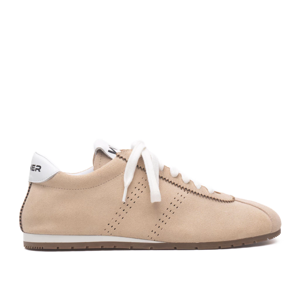 A cor desse modelo é um tom de nude em material de camurça couro.