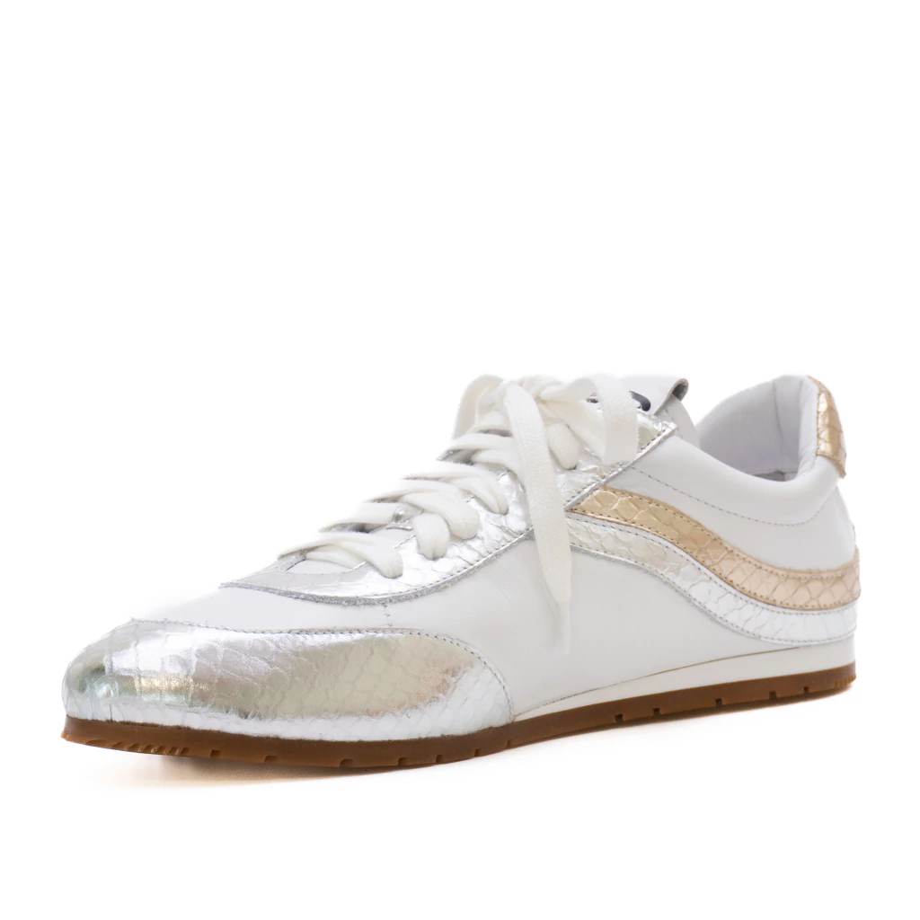 A cor desse modelo é um tom de branco em material napa couro e a cor champagne e prata em material metalizado texturizado.