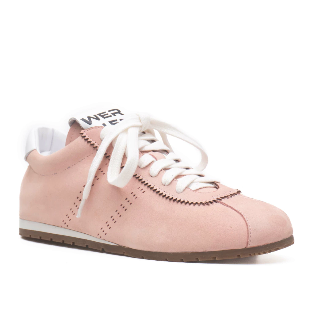 A cor desse modelo é um tom de rosa em material de camurça couro.